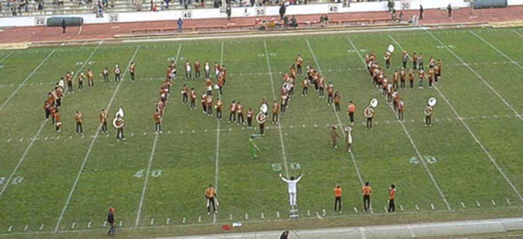 Where a traditional band usually gets from one formation to the next through some precision marching, we typically scramble, a maneuver that can be described as “Entropy in Action” or “Random Incarnate.” A well-executed scramble may look like a cross between a riot, a fire drill, and a half-off sale at Macy’s….. shown here, actual size.